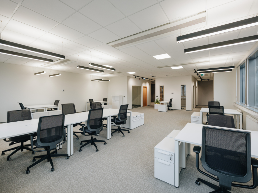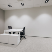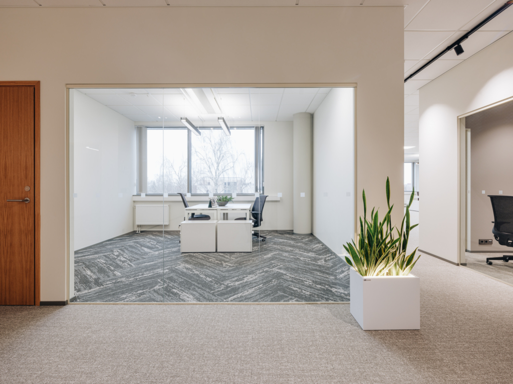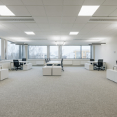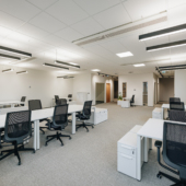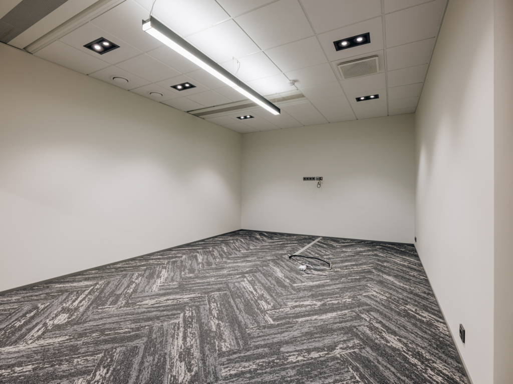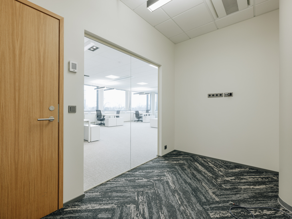 Space consists of open space area, meeting rooms, two private offices, toilets, server room, storage room and kitchen corner. The space is ready to move in.