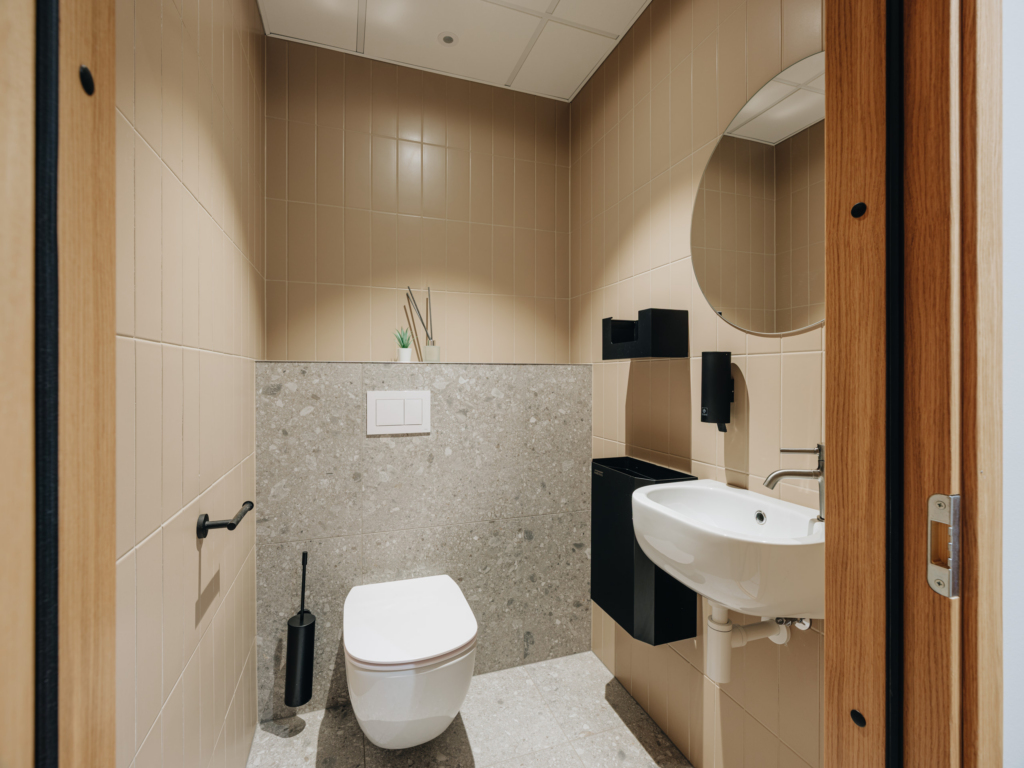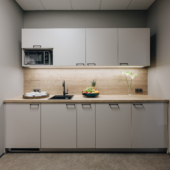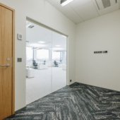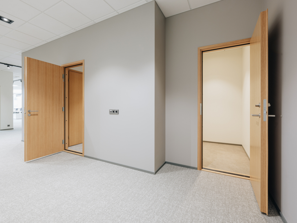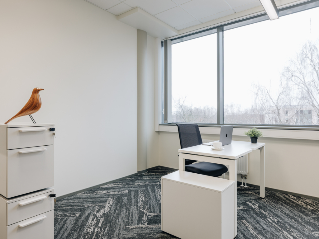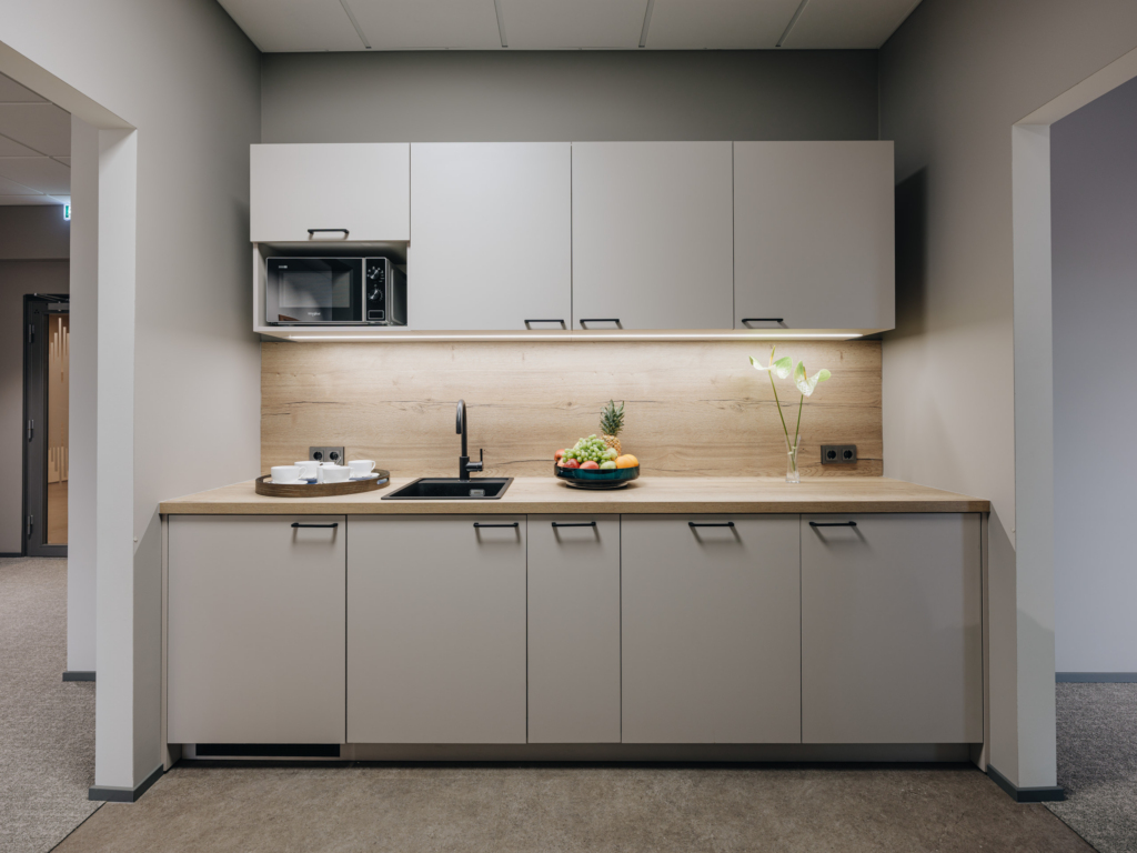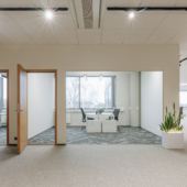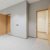 Space consists of open space area, meeting rooms, two private offices, toilets, server room, storage room and kitchen corner. The space is ready to move in.
